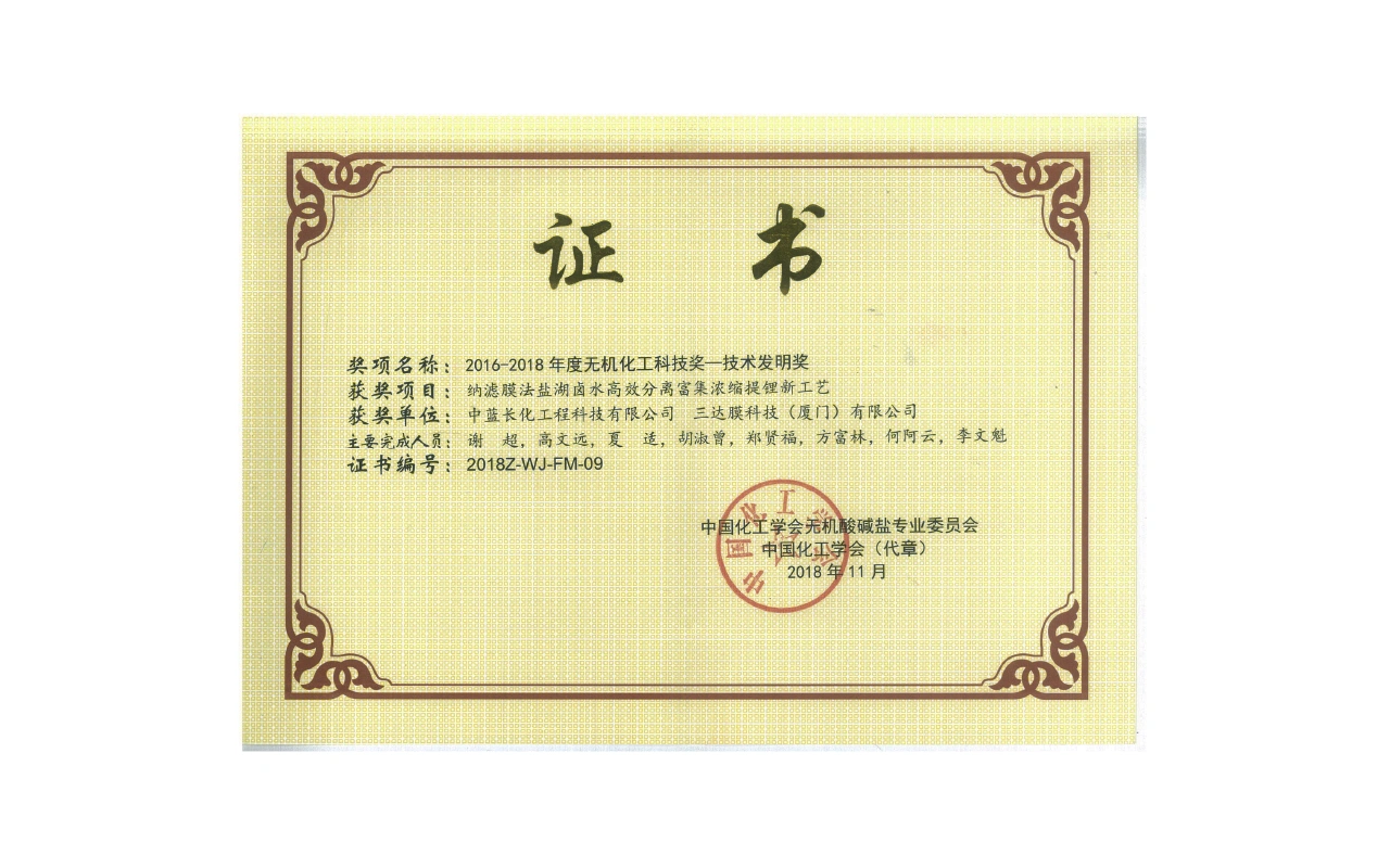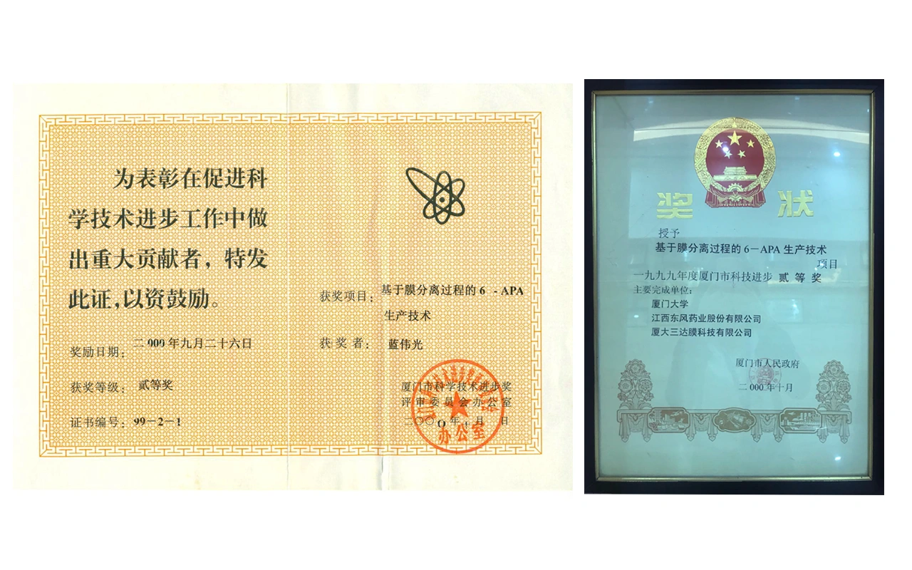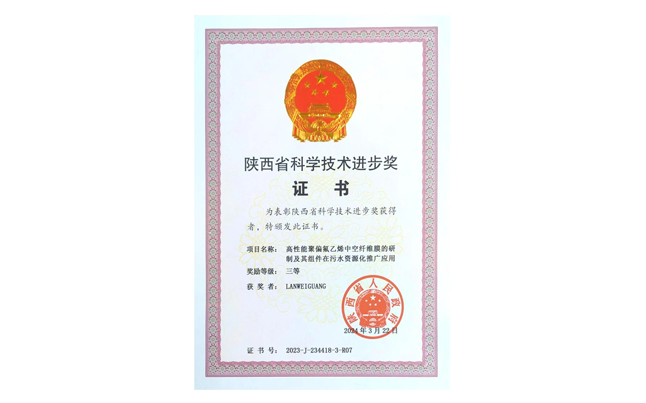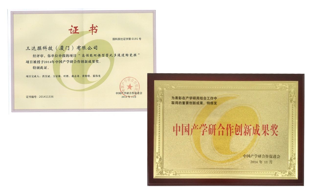 获“中国产学研合作创新成果奖”(高性能环保型管式多通道陶瓷膜)。