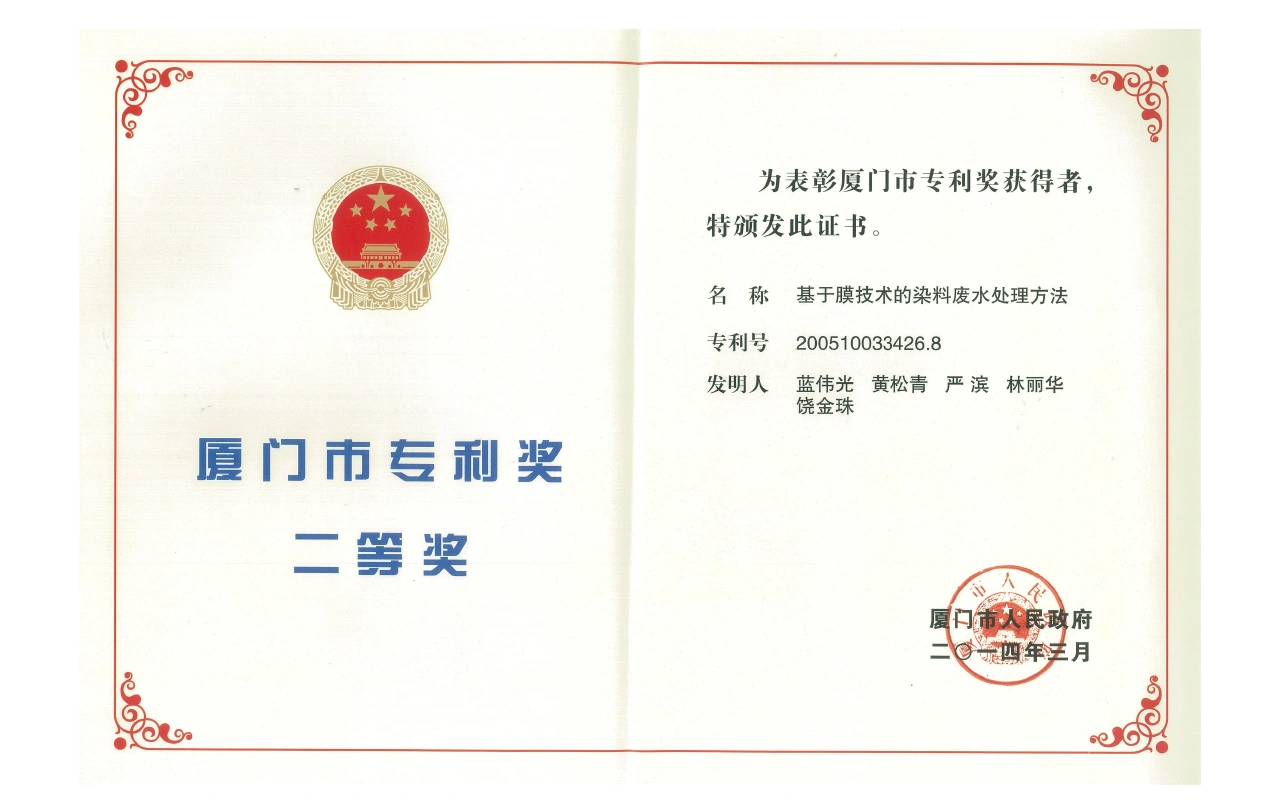 获“厦门市专利二等奖”(基于膜技术的染料废水处理方法)。