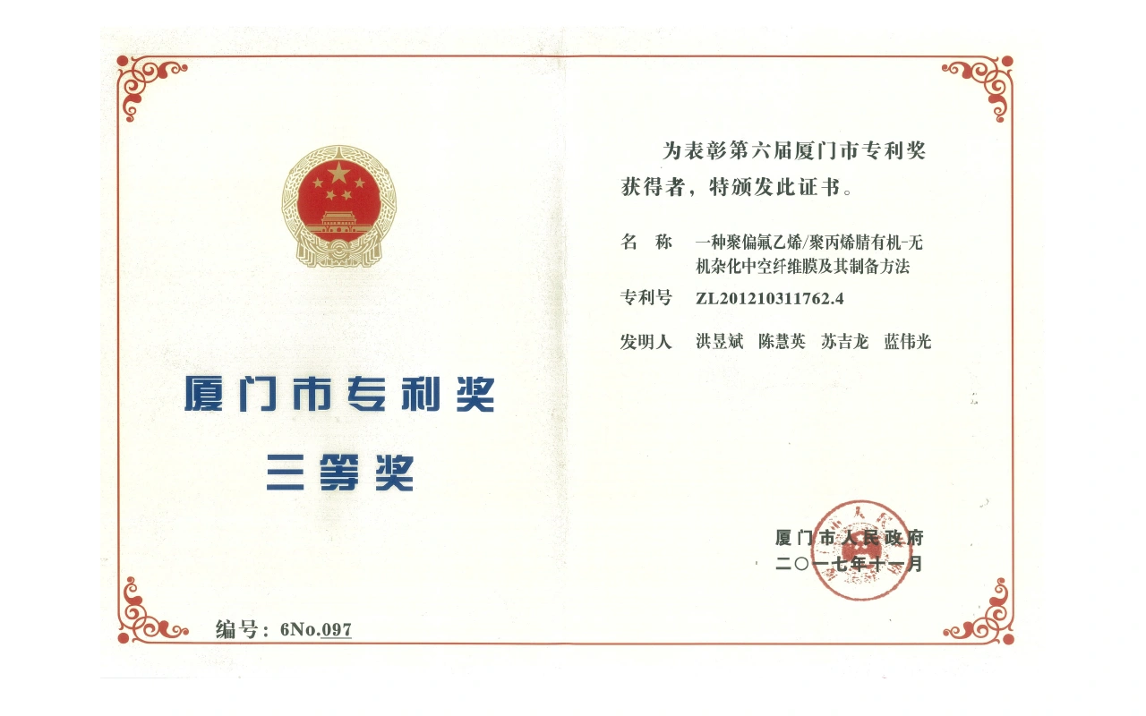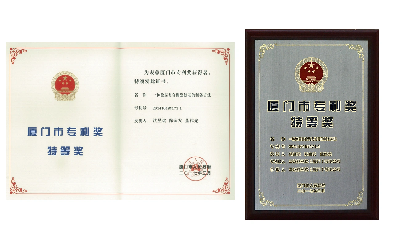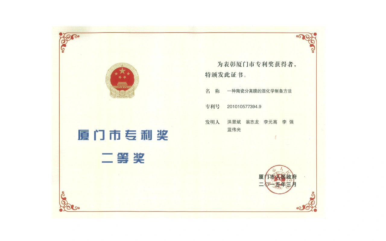 获“厦门市专利奖特等奖”(一种涂层复合陶瓷滤芯的制备方法)。