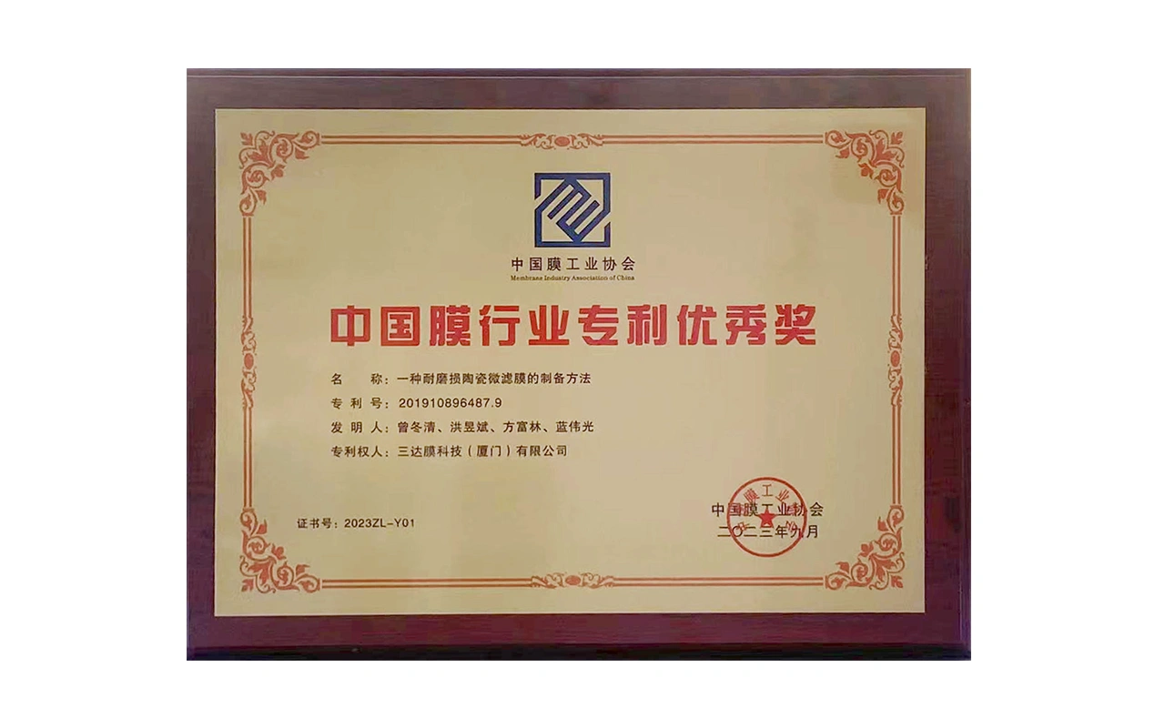 获“中国膜行业专利优秀奖”(一种耐磨损陶瓷微滤膜的制备方法)。